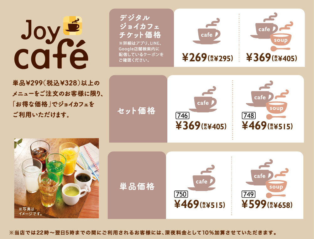 単品¥299(税込¥328)以上のメニューをご注文のお客様に限り、「お得な価格」でジョイカフェをご利用いただけます。