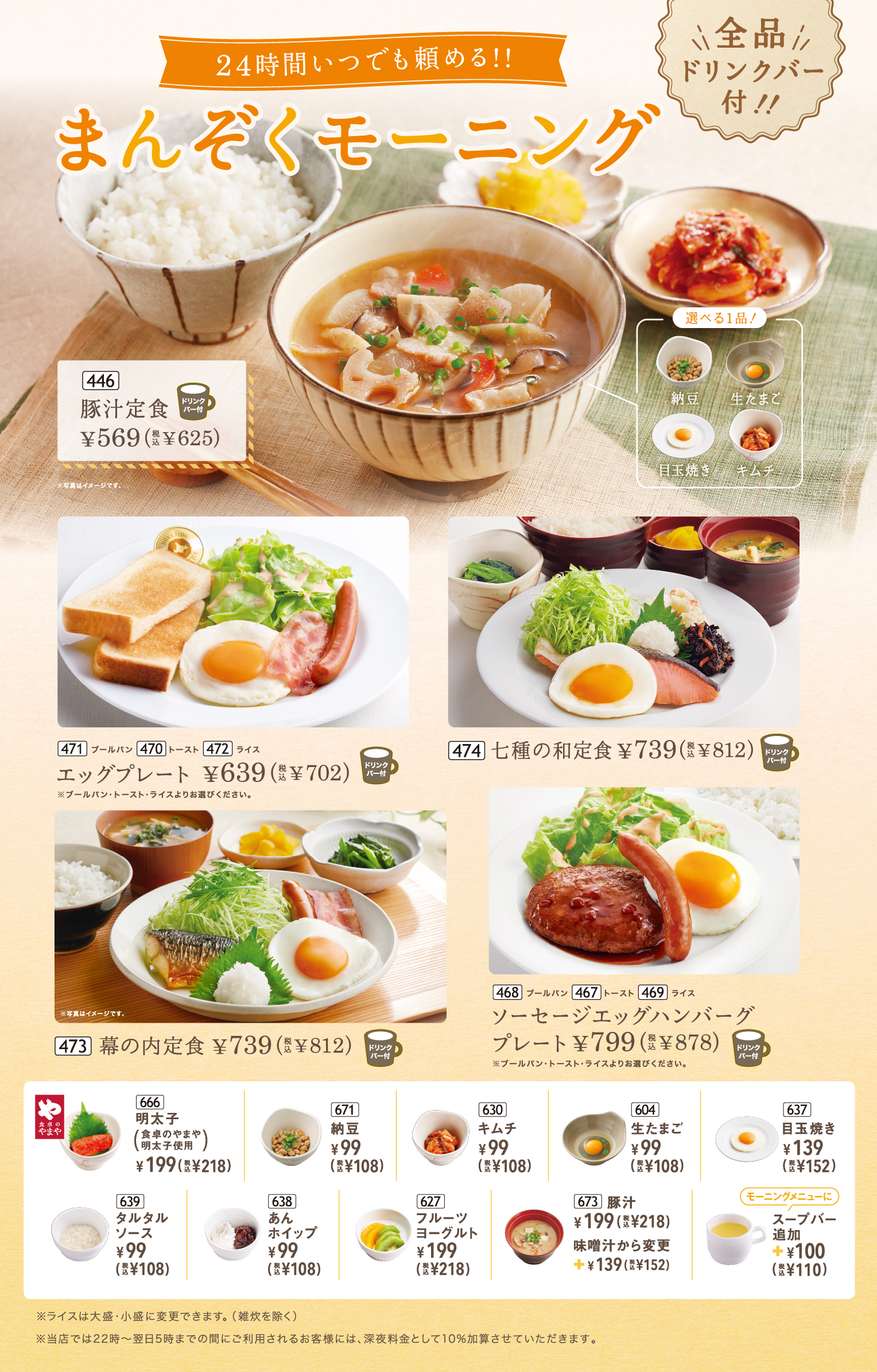 ※一部店舗では販売商品、販売価格が異なります。 メニューの栄養情報は、こちらからご覧いただけます。 ※全品ドリンクバー付です。 ※モーニングメニューはプラス100円(税込110円)でスープバーもご利用いただけます。 ※22時~翌日5時までの間にご利用されるお客様には、深夜料金として10%加算させていただきます。 ※ライスは大盛・小盛に変更できます。