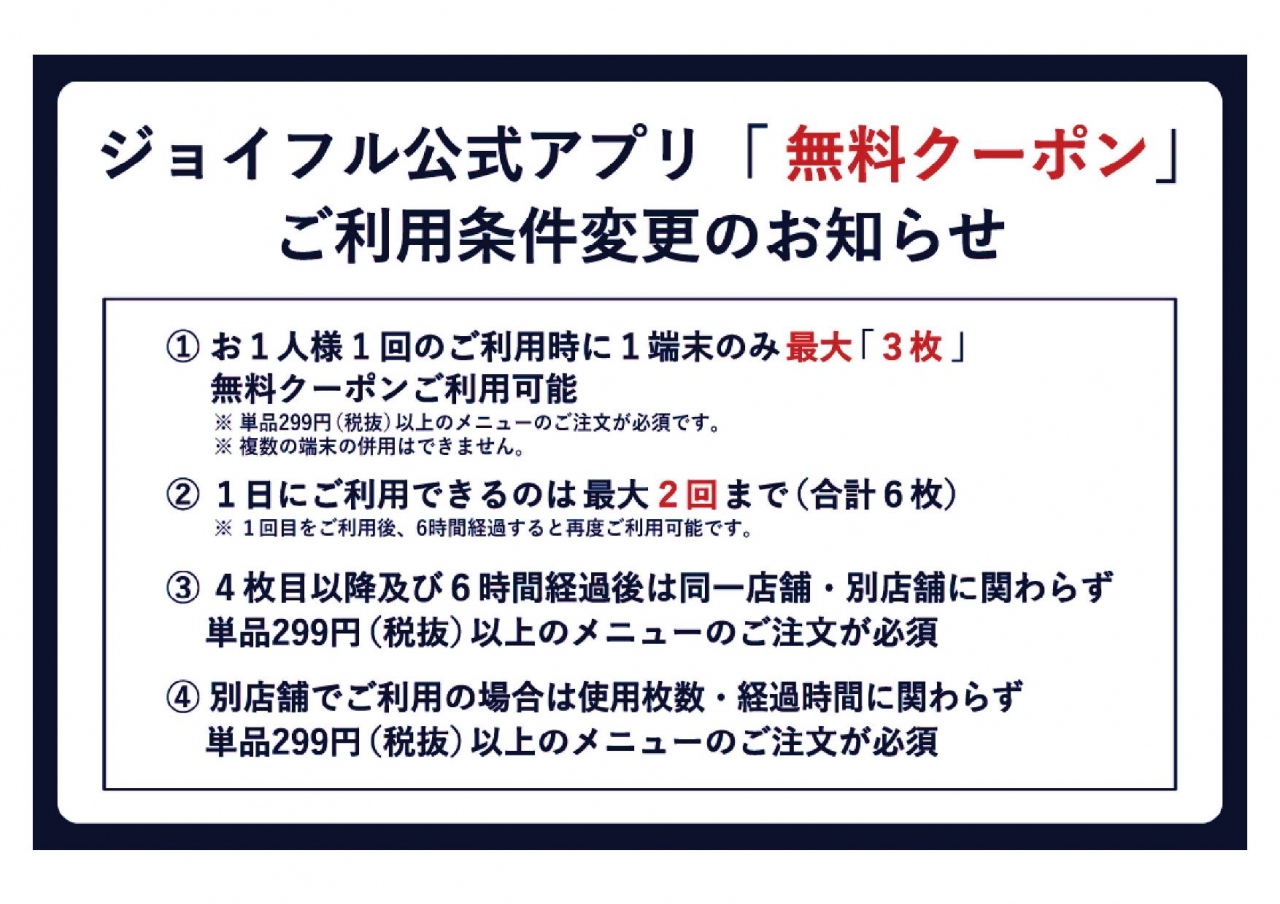 ジョイフル公式アプリ「無料クーポン」ご利用条件変更のお知らせ